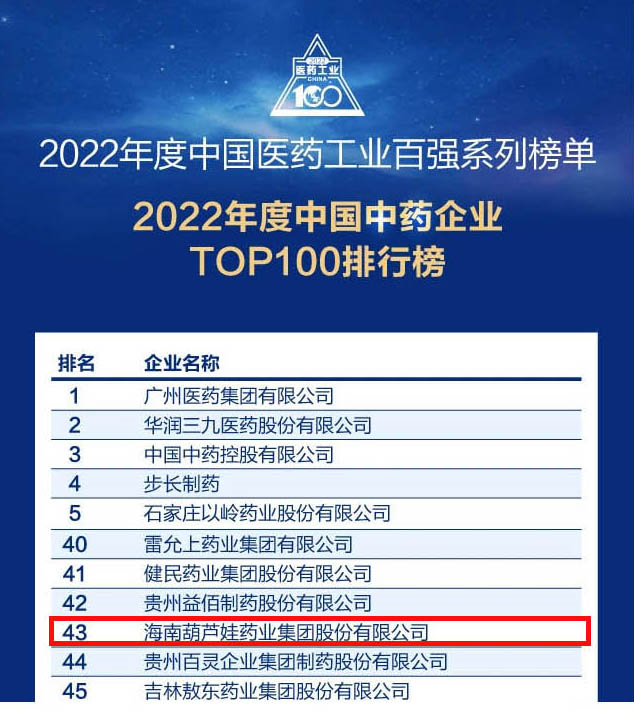 会议期间,一年一度的中国医药工业百强系列榜单隆重揭晓,利来w66药业集团凭借领先的研发优势和扎实的生产实力以及稳健的市场推广能力,连续第四年成功入选“2022年度中国中药企业TOP100排行榜” ,排名稳步上升至第43位。